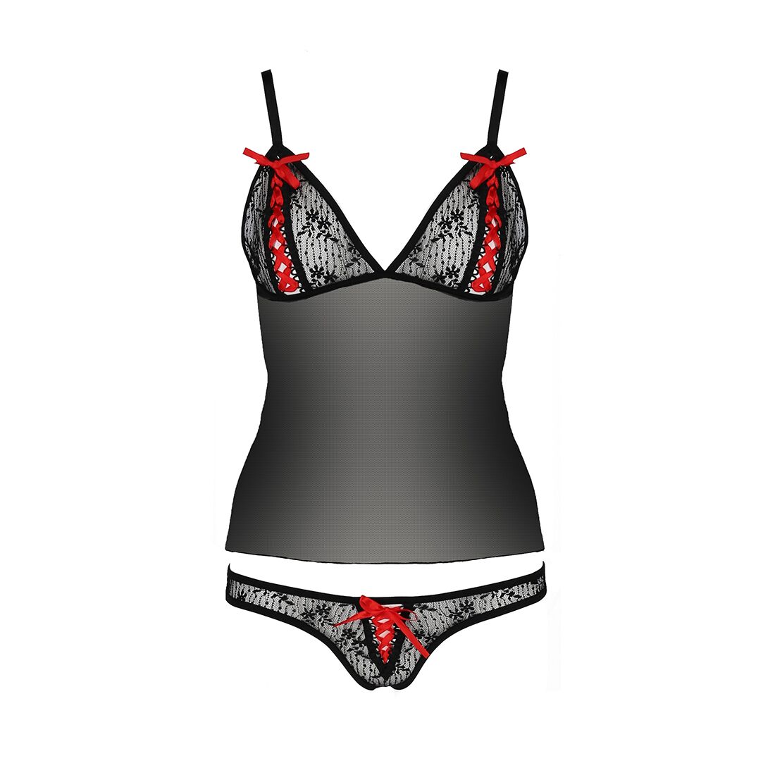 Комплект изготовлен из качественного материала, который легко переносит стирку. Бретели плоские и регулируются по длине для максимально четкой посадки по фигуре. Обратите внимание на яркие акценты – разрезы с красной шнуровкой. Они вызывают желание потрогать, развязать все ленты и продолжить свидание в максимально интимном общении.