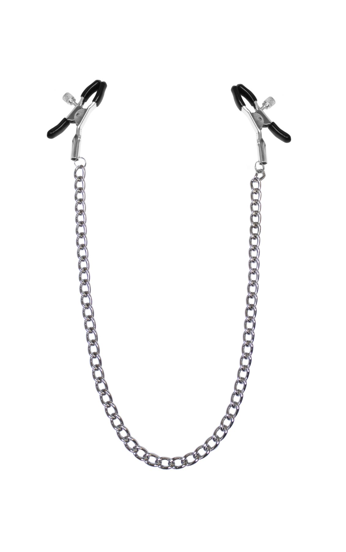 Классические зажимы для сосков, соединенные цепочкой, позволяет создать нужный уровень давления на сосок, а также — играть, потягивая за цепочку, давая ее в рот подопечной или прикрепляя к чему-то.